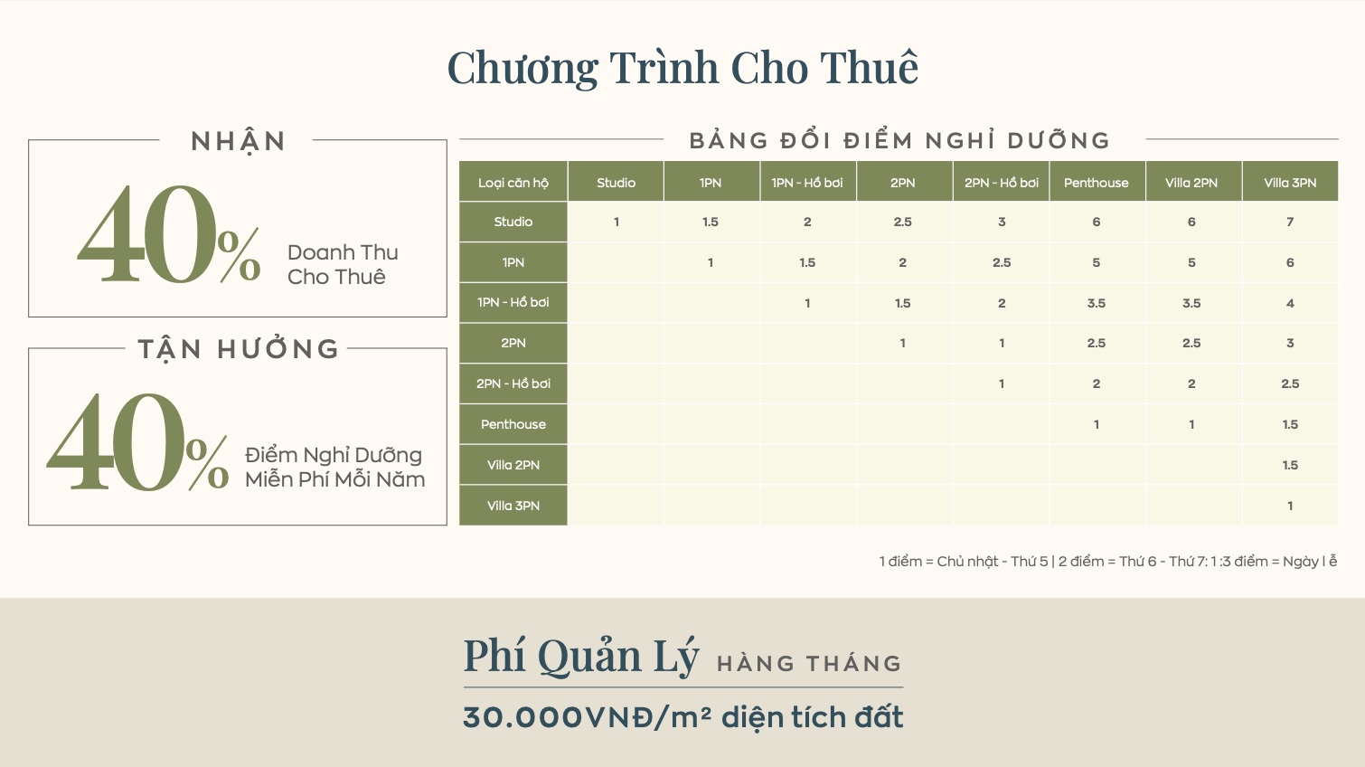 - 40 điểm nghỉ dưỡng: tương đương 40 đêm, có thể quy đổi sang các loại căn lớn hơn trong cùng hệ thống Fusion Hồ Tràm.