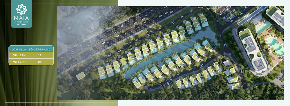 Toàn khu Maia Resort Hồ Tràm được quy hoạch chỉ với 36 căn biệt thự giới hạn, trải dọc theo hồ nước trung tâm và mảng xanh tự nhiên, tạo nên bố cục mềm mại, thoáng đãng và giàu năng lượng.